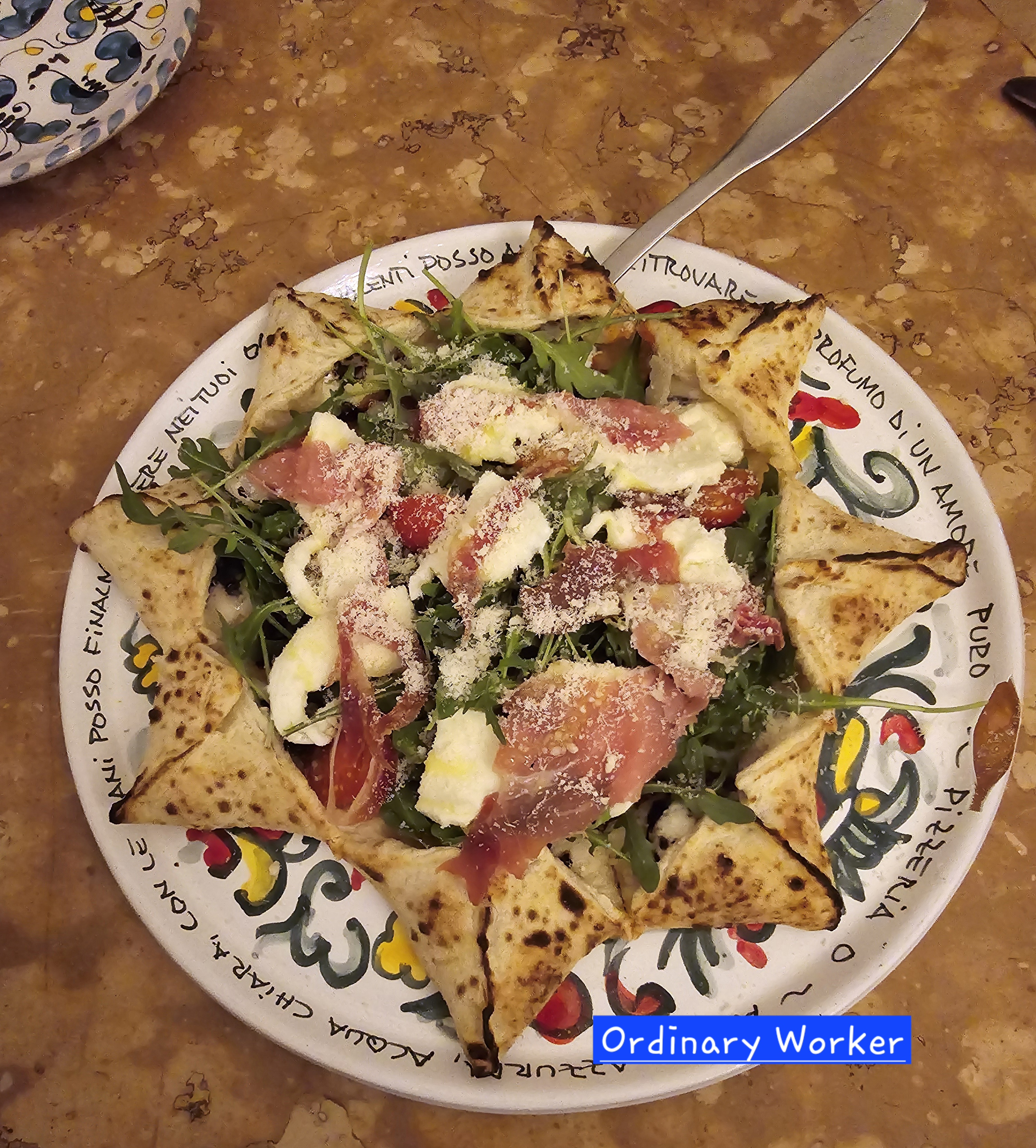 피자에 루꼴라와 얇게 저며진 프로슈토가 올라갔다.
